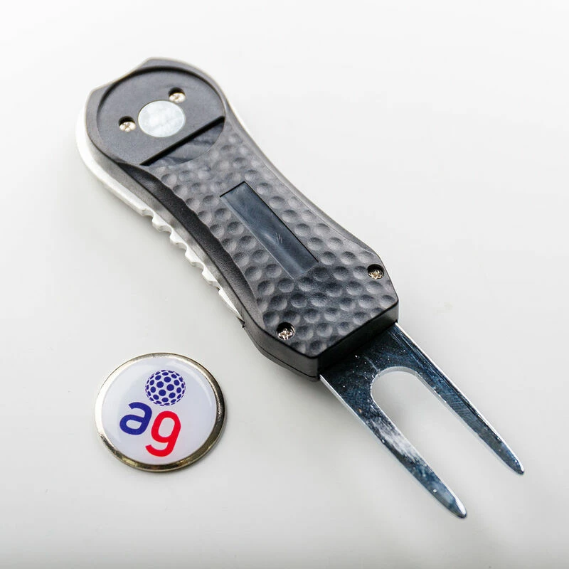 This essential golf accessory is designed for the golfer that needs a compact and durable tool to repair pitch marks around the greens. The switchblade style tool springs out into action with a simple press of a button and can be easily folded back into its original compact position. For extra functionality, it has a detachable ball marker to mark your ball before you repair any divot holes on the green.