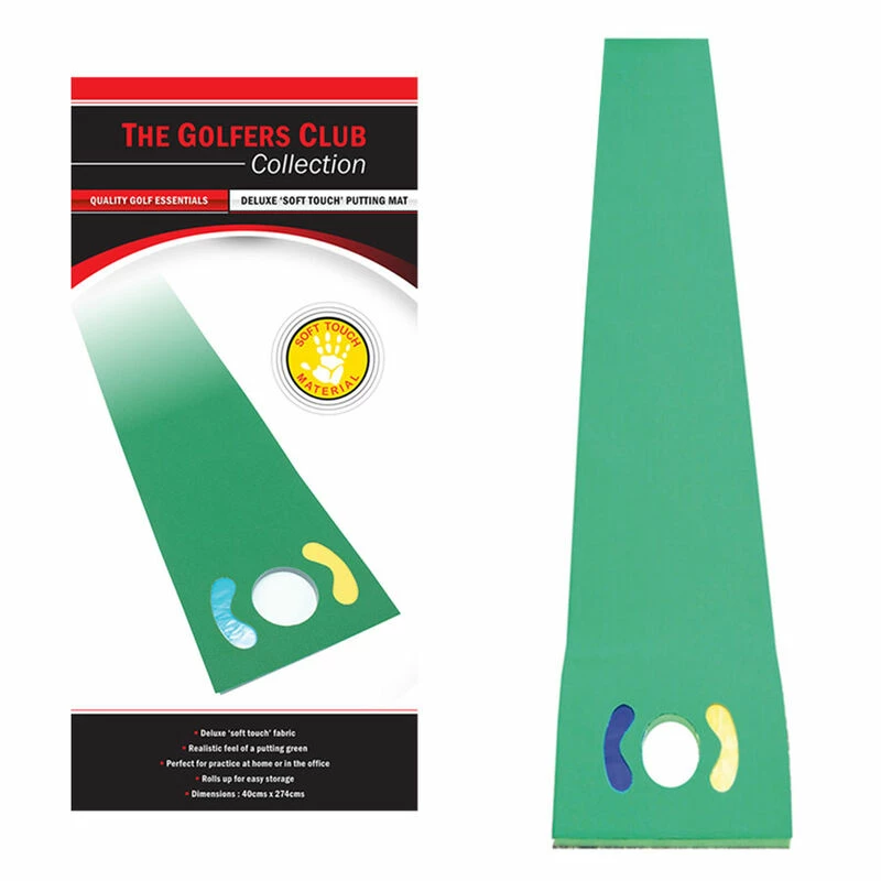 The soft-touch fabric of the mat provides the feel of a real putting surface. It has a standard-sized hole and includes bunker and water hazards. The mat is perfect for use at home or the office and can be rolled up for easy storage.