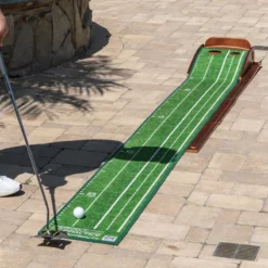 This premium putting 9ft 6″” mat has been constructed with Crystal Velvet Trueroll Technology to simulate real green putting conditions. It has 2 different sized holes to aim for, one regulation size and the other reduced for even more precision. Plus includes an auto ball return system to ensure your practice sessions are up to speed, without going to collect the golf ball over and again. The mat is highlighted with train track alignment lines and marked at, 2, 4, 6, 8 feet has an uphill section, and reads 10-14 on a stimp meter which is fast paced.